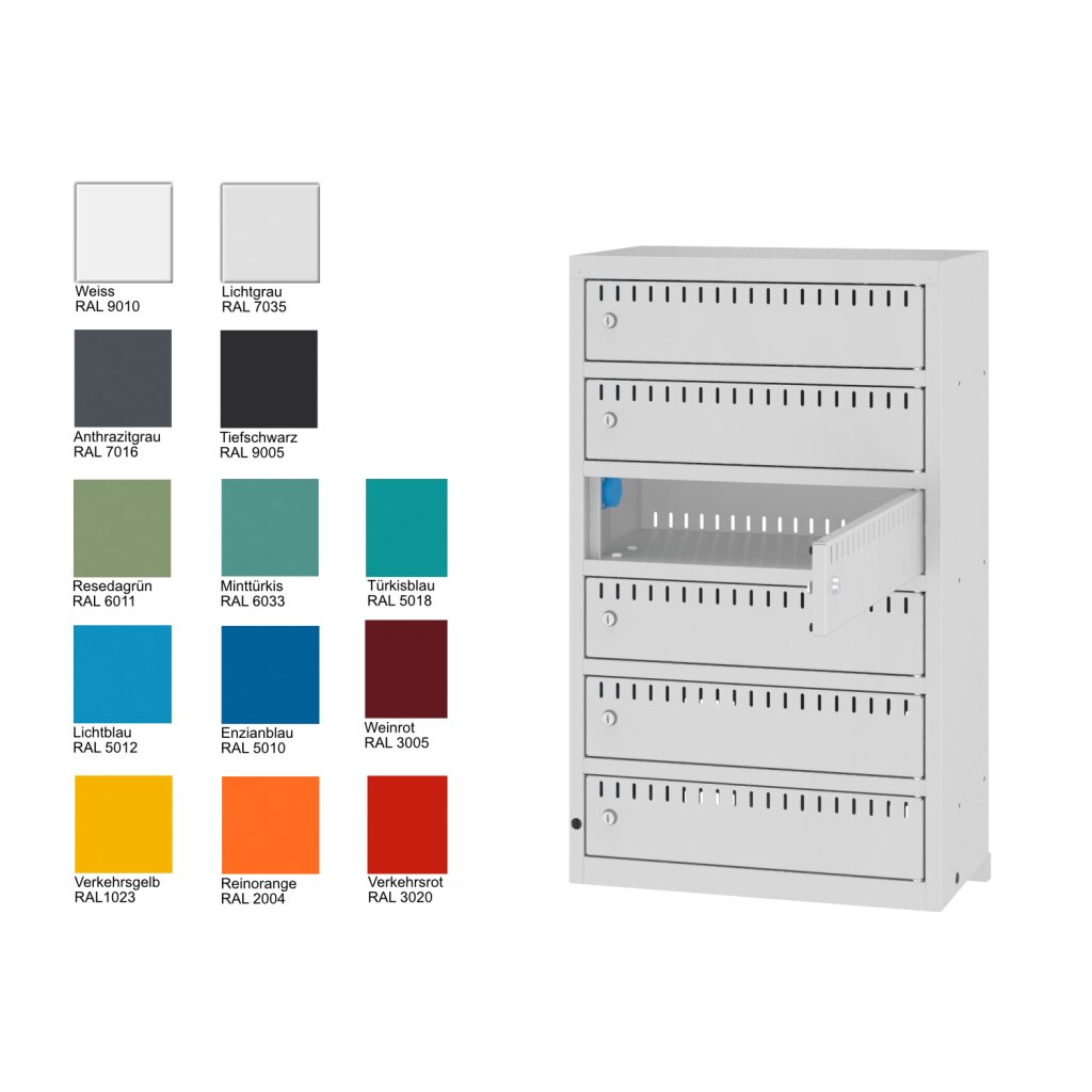 Robuste Pulverbeschichtung in großer Farbauswahl. Farbe von Korpus und Türen kann unterschiedlich ausgewählt werden.