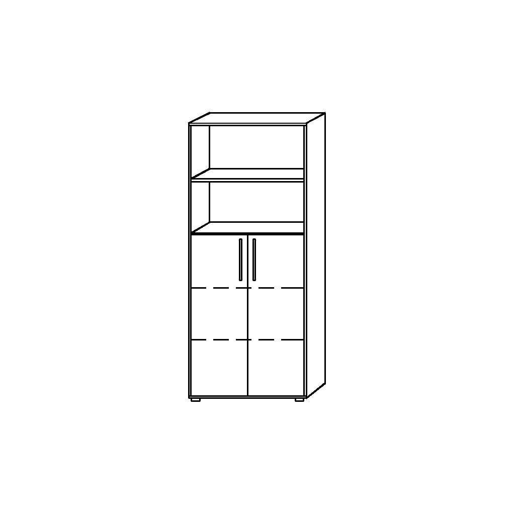 Faltrückwand, in Falz einliegend, verschraubt. Inklusive 4 Einlegeböden auf Metallbodenträgern, im Raster von 32 mm höhenverstellbar, Lochreihenbohrung vorhanden.