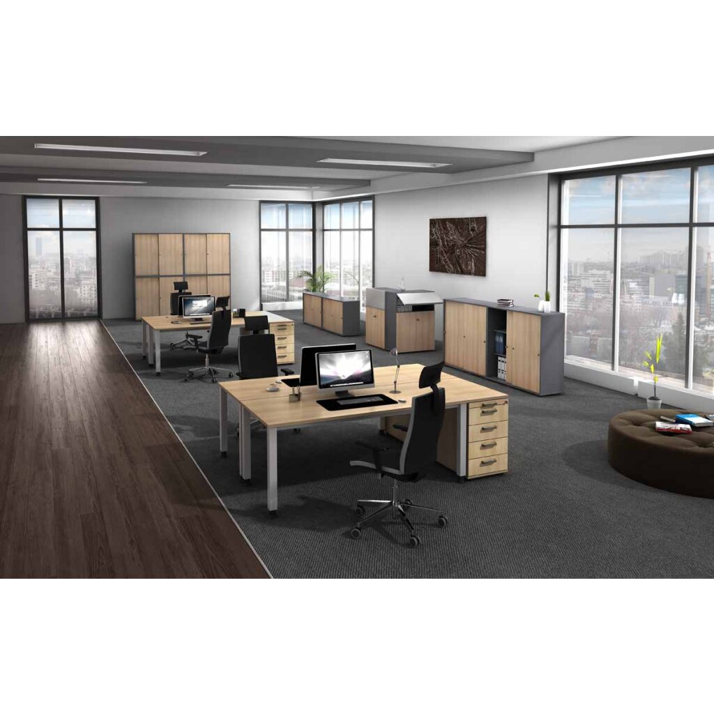 MATERIAL: melaminharzbeschichtete Platten nach DIN 68765, Emissionsklasse E1, Vorderkante mit 2 mm ABS-Kanten, gerundet. Seiten, Platte und Boden 19 mm dick. TRAGKRAFT: 25 kg pro Fachboden