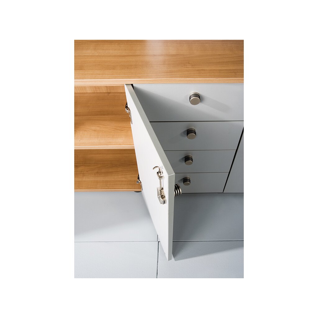 melaminharzbeschichtete Platten nach DIN 68765, Emissionsklasse E1, Vorderkante mit 2 mm ABS-Kanten, gerundet. Seiten, Platte und Boden 16 mm dick, Zwischenböden und Fachböden 19 mm dick.