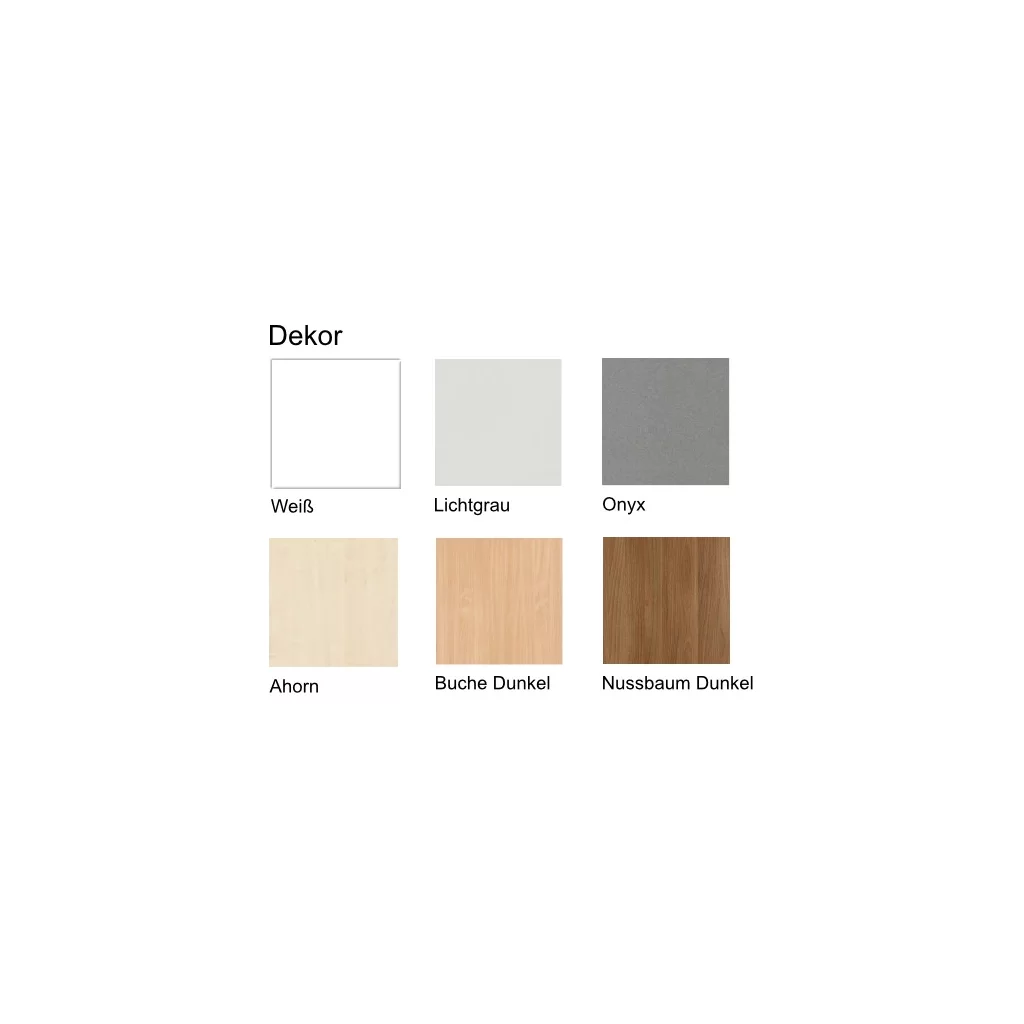 Dreischicht-Feinspanplatte mit Melaminharz-Beschichtung nach DIN 68765 in verschiedenen Holzdekoren.