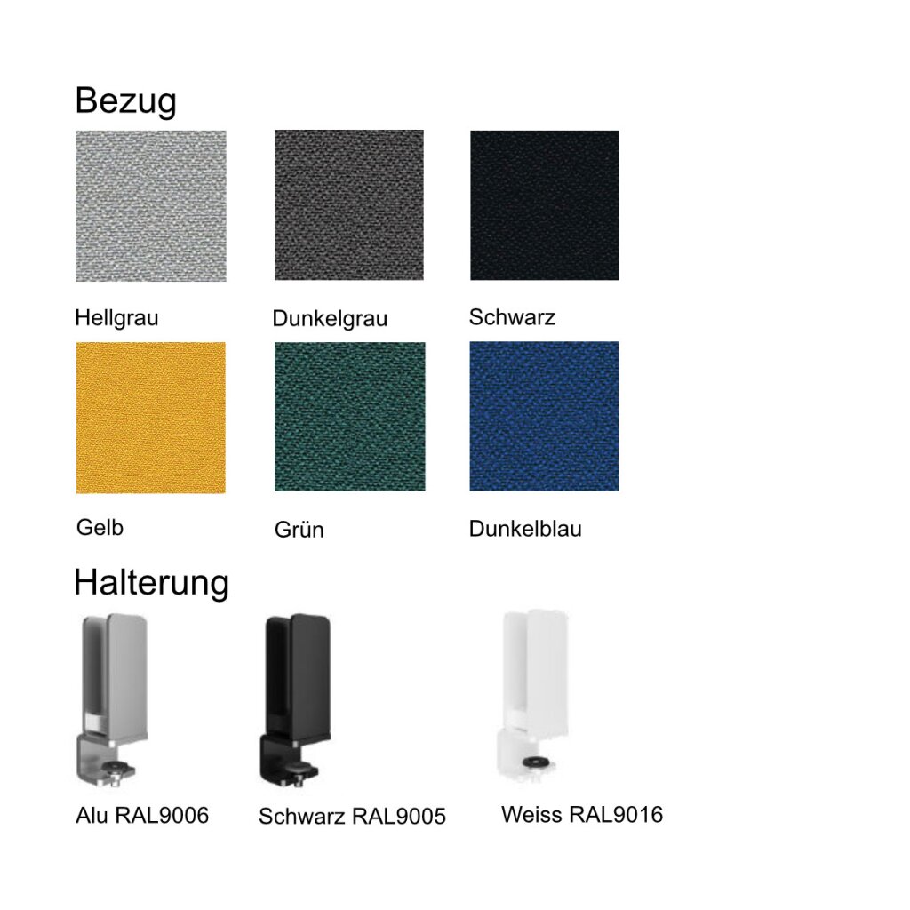Folgende Stofffarben sind verfügbar: Hellgrau, Dunkelgrau, Dunkelblau, Gelb, Grün, Schwarz