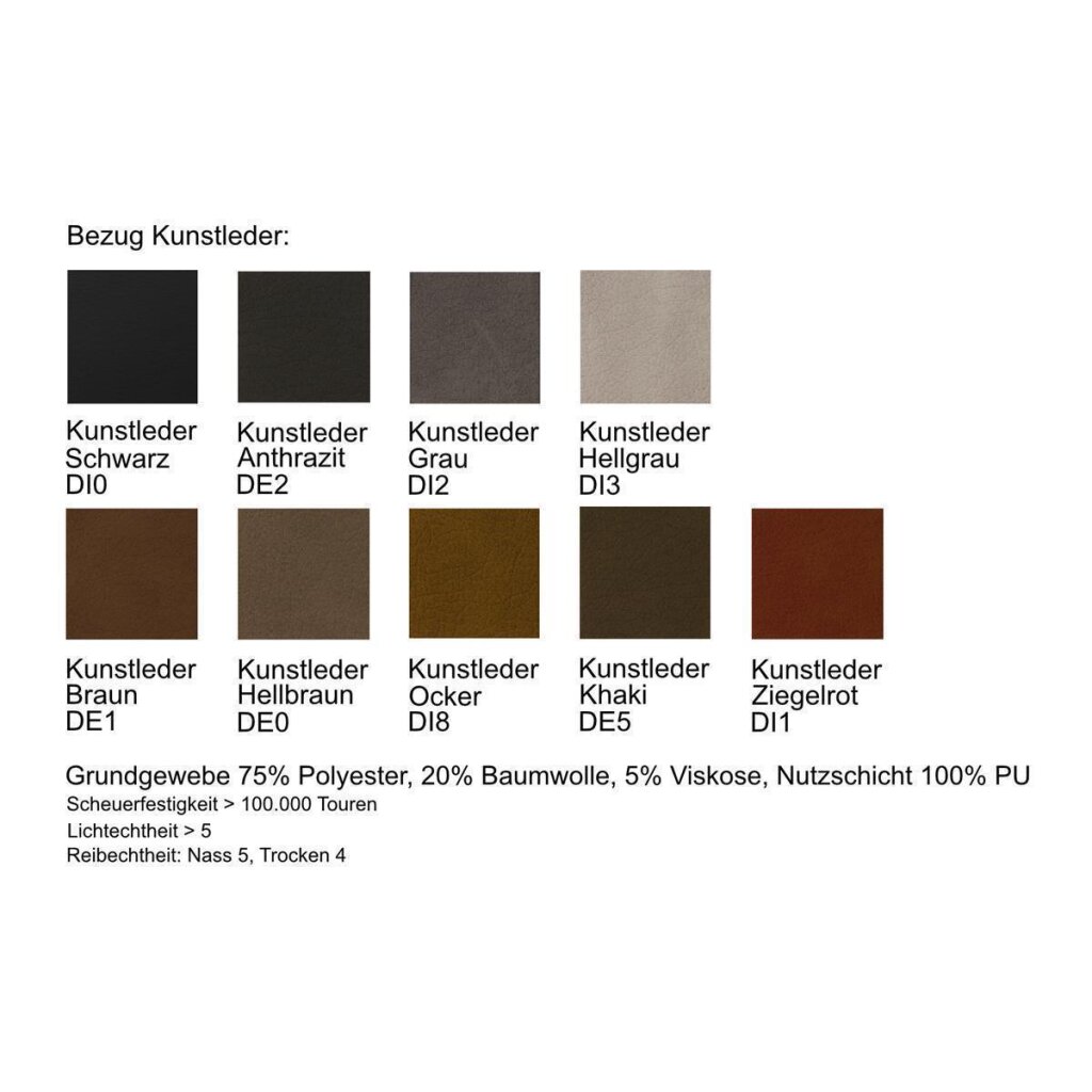 Kunstleder DE / DI: leicht genarbt, sieht daher aus wie echtes Leder, hoch belastbar bis 100.000 Scheuertouren, Lichtechtheit Note 5, Reibechtheit Nass 5 und Trocken 4, 75 % Polyester, 20 % Baumwolle, 5% Viskose, Nutzschicht 100 % PU. (Polyurethan = zusätzlichen Schutz, stark wasserabweisend)