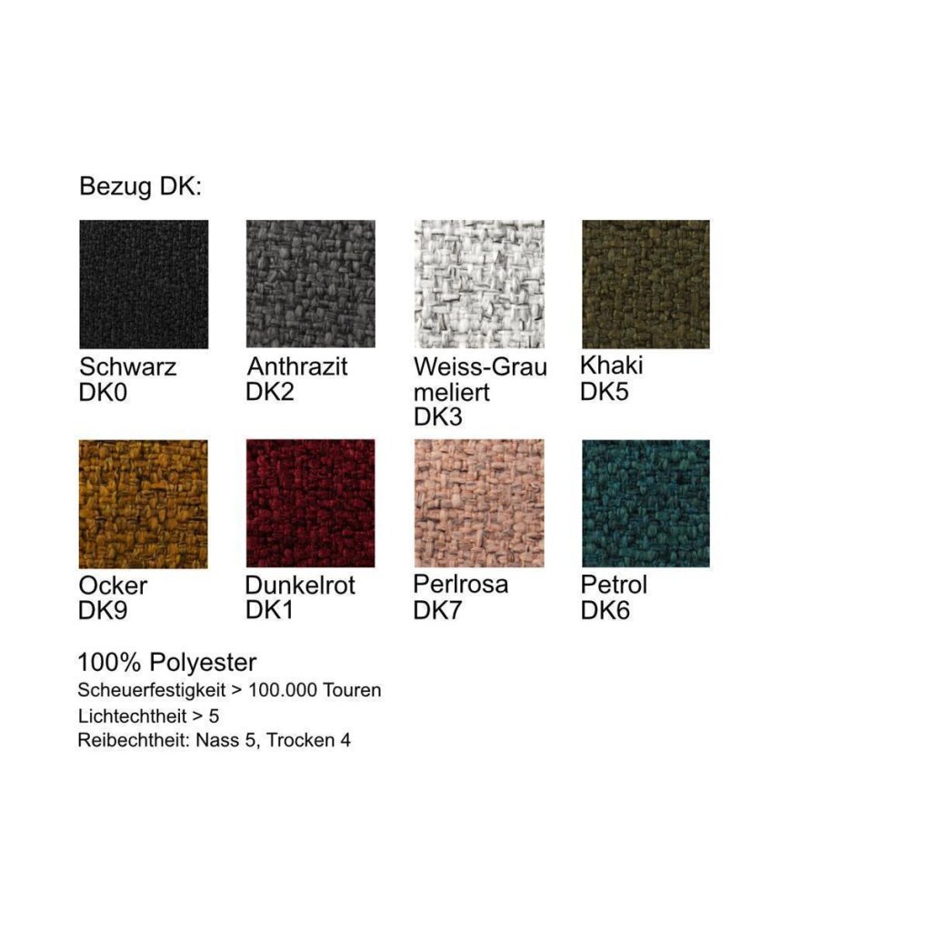 Stoff DK: grob gewebter Stoff, hoch belastbar bis 100.000 Scheuertouren, Lichtechtheit Note 5, Reibechtheit Nass 5 und Trocken 4, 100 % PES Polyester.
