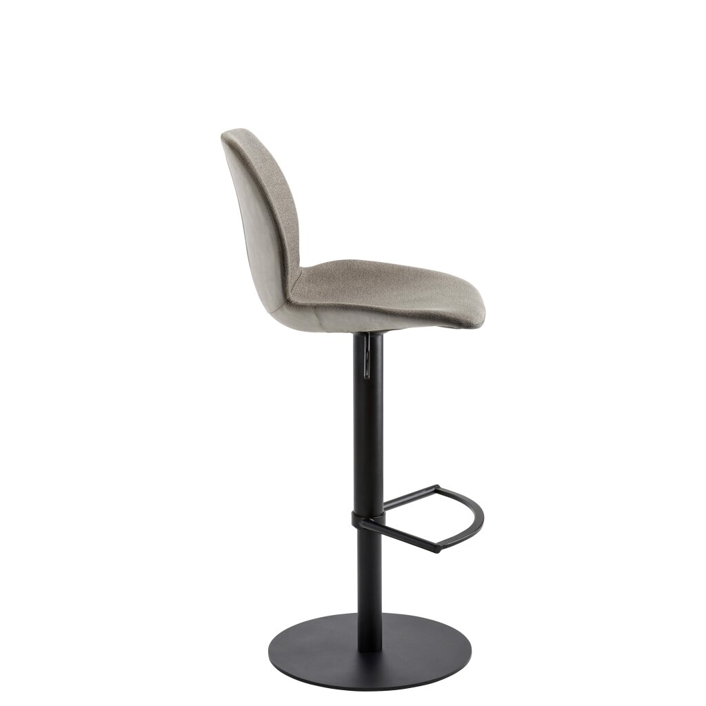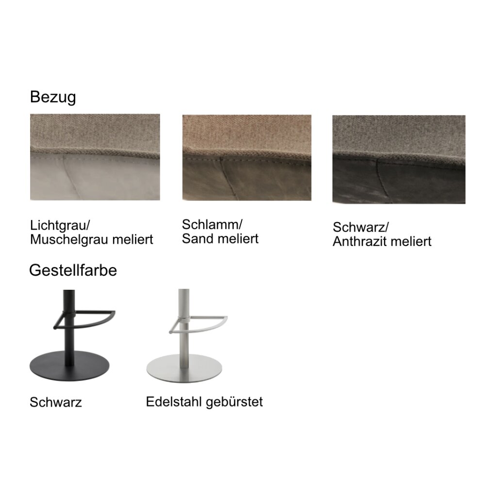 Gepolsterte Sitzschale innen mit meliertem Stoff, Rücken und Unterseite aus Kunstleder im Vintage Look. 360° Drehmöglichkeit. Design-Fußstütze. Stufenlose Höhenverstellung der Sitzhöhe von 53-78 cm durch Gasfeder.