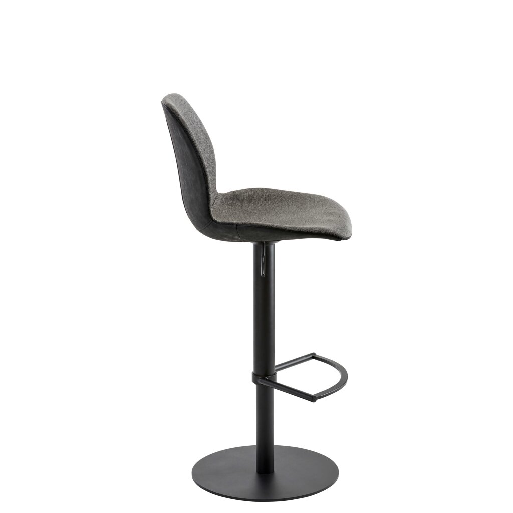 Gepolsterte Sitzschale innen mit meliertem Stoff, Rücken und Unterseite aus Kunstleder im Vintage Look. 360° Drehmöglichkeit. Design-Fußstütze. Stufenlose Höhenverstellung der Sitzhöhe von 53-78 cm durch Gasfeder.