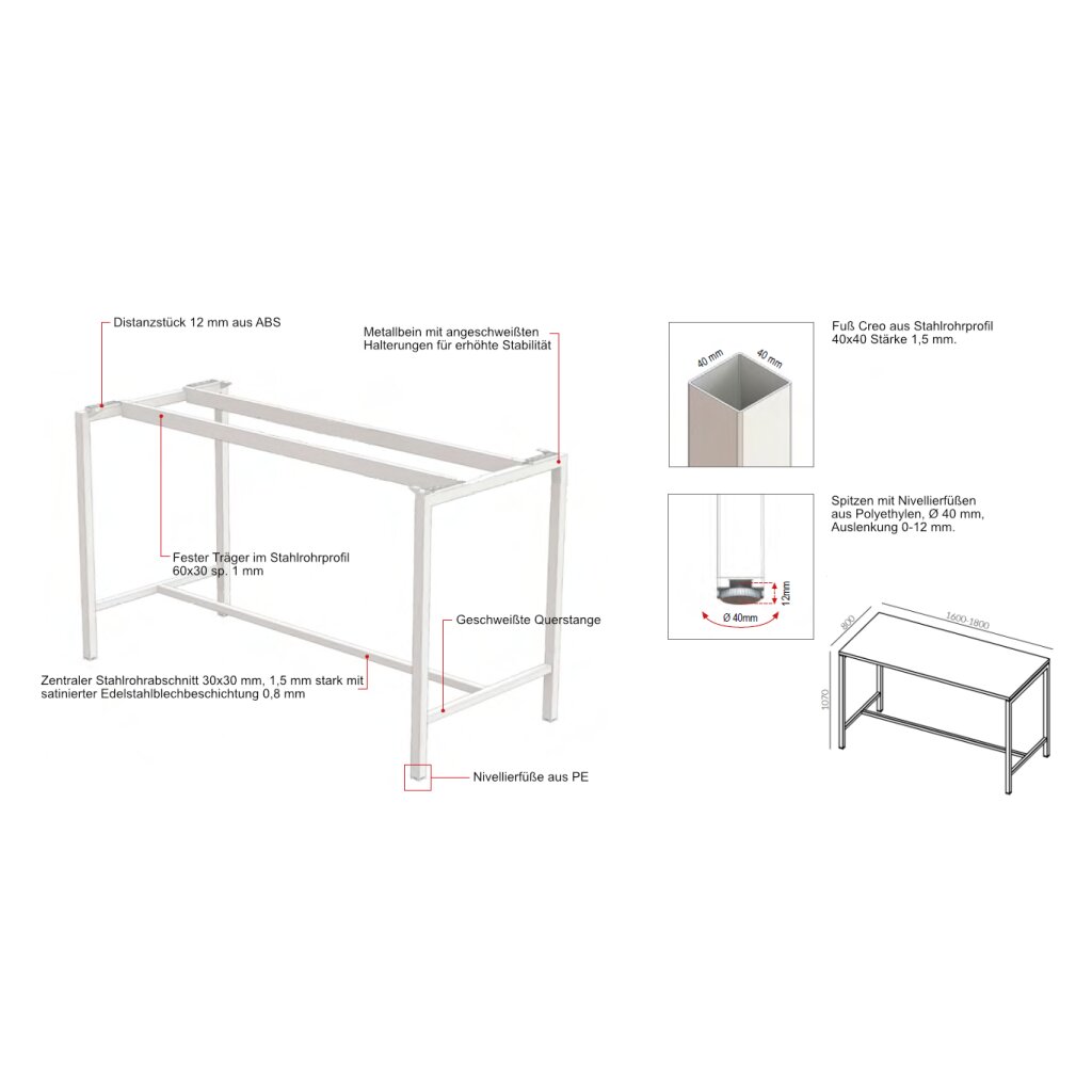 Füsse: Stahlrohr 40 x 40 mm, Stärke 1,5 mm, inkl. Höhenausgleichsschrauben im Fuss