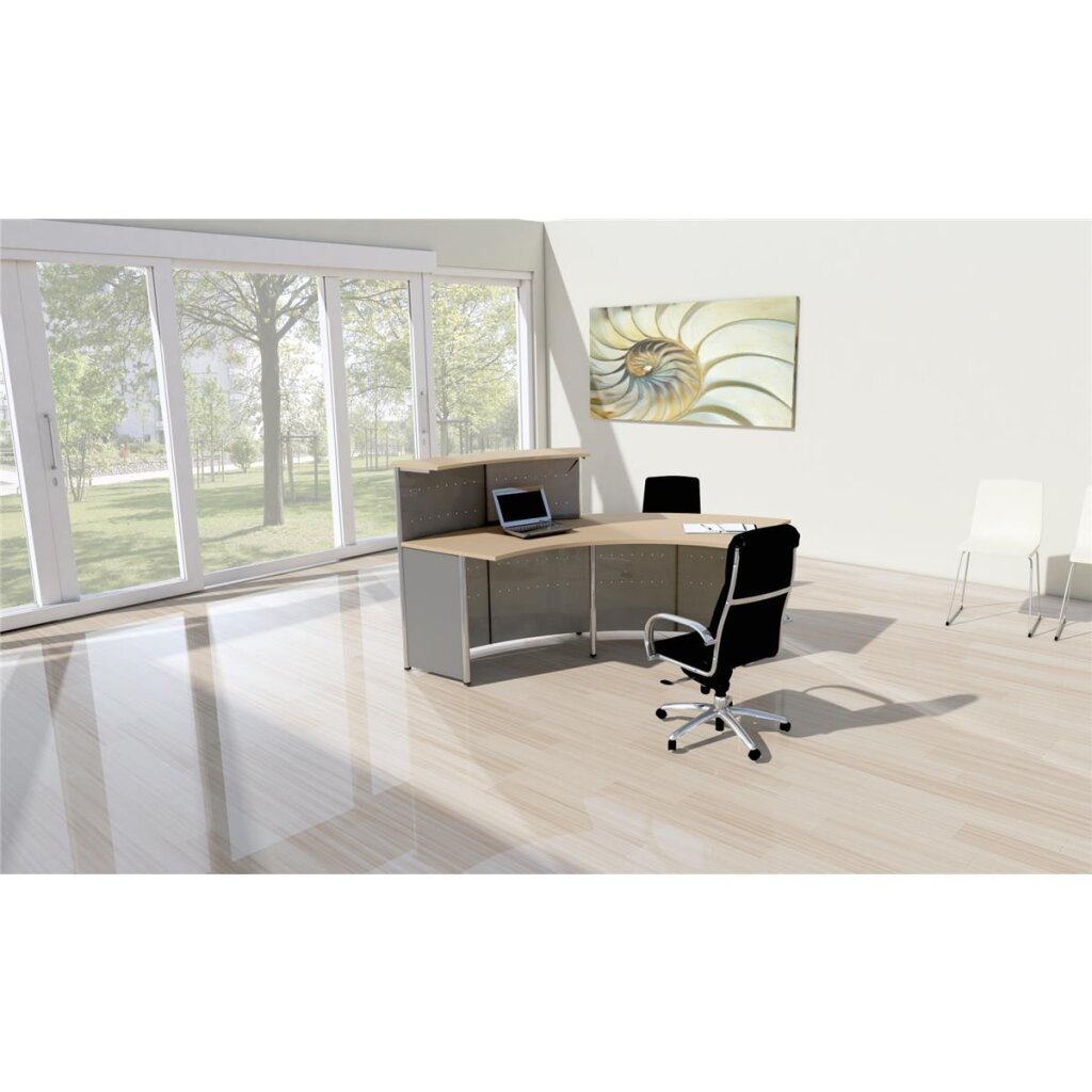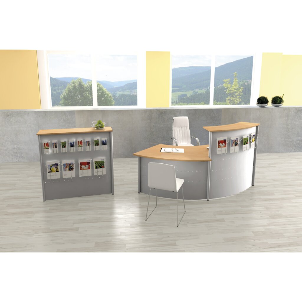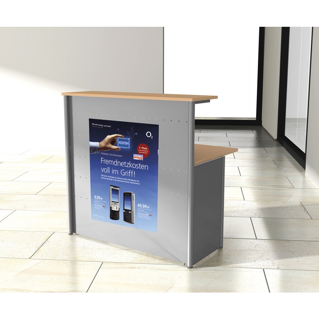 Hinter der Thekenfront befindet sich ein vollwertiger Arbeitsplatz. Die Arbeitsplatte der Theke hat eine Tiefe von 65 cm und eine Höhe von 72 cm. Sie ist mit Melaminharz beschichtet und mit stoßfesten ABS-Kanten versehen. Des Weiteren sind Kabeldurchlässe vorhanden.