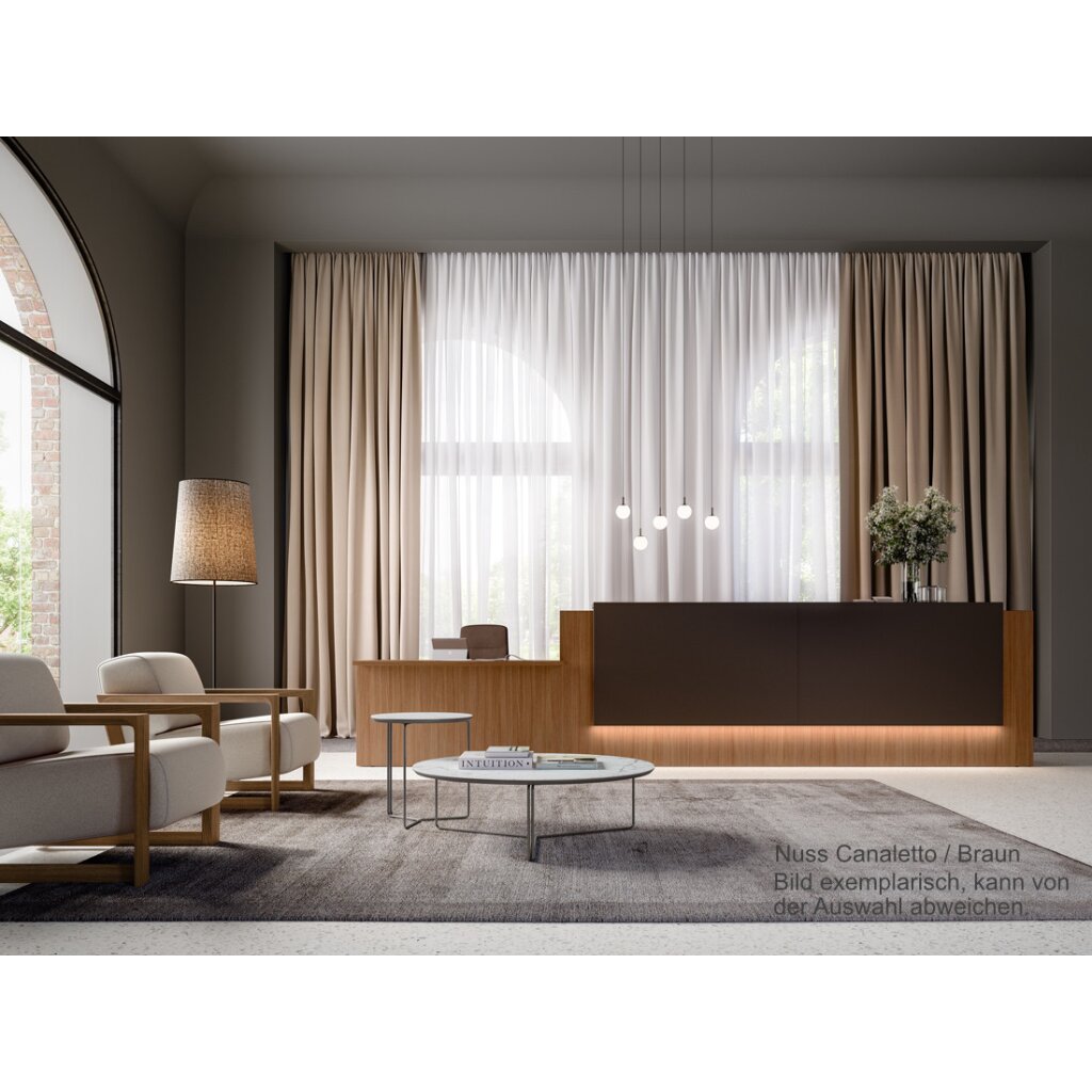 Dekore Empfangsablage: in Melamin Weiss (BA), Eukalyptus (EC), Nuss Canaletto (NO), Eiche (RK) oder Ulme (OL), lackiert in vielen verschiedenen RAL Farben oder in Leder