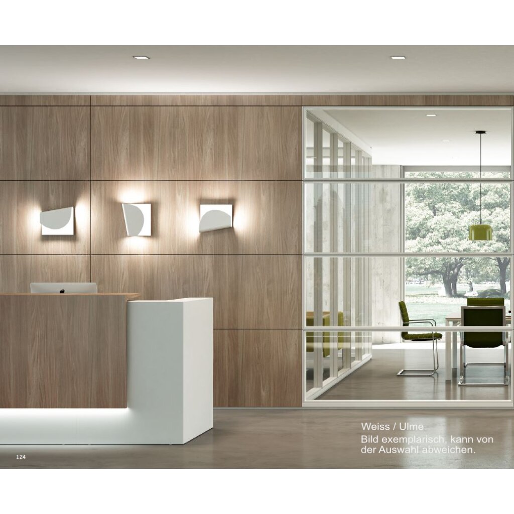 Dekore Empfangsablage: in Melamin Weiss (BA), Eukalyptus (EC), Nuss Canaletto (NO), Eiche (RK) oder Ulme (OL), lackiert in vielen verschiedenen RAL Farben oder in Leder