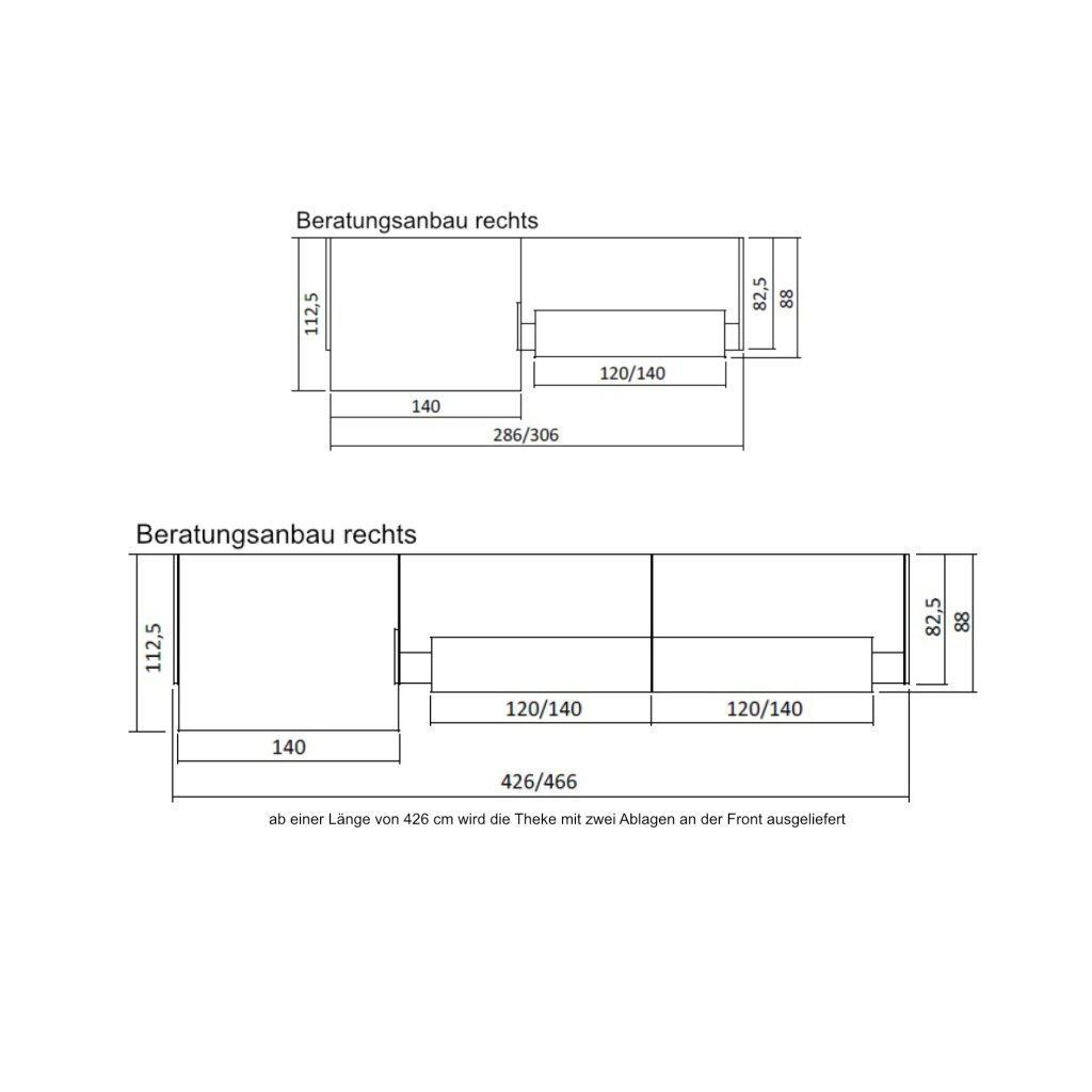 Thekenlänge / Länge Ablage: 286 / 120, 306/ 140, 426 / 2x 120 , 466 / 2x 140 in cm