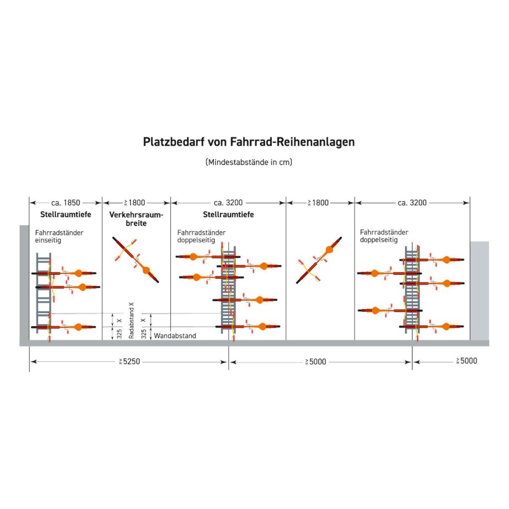 Dieser Ständer ist für Fahrräder mit Reifenbreiten von bis zu 55 mm geeignet. Typische Einsatzgebiete finden sich in Betrieben, kleineren