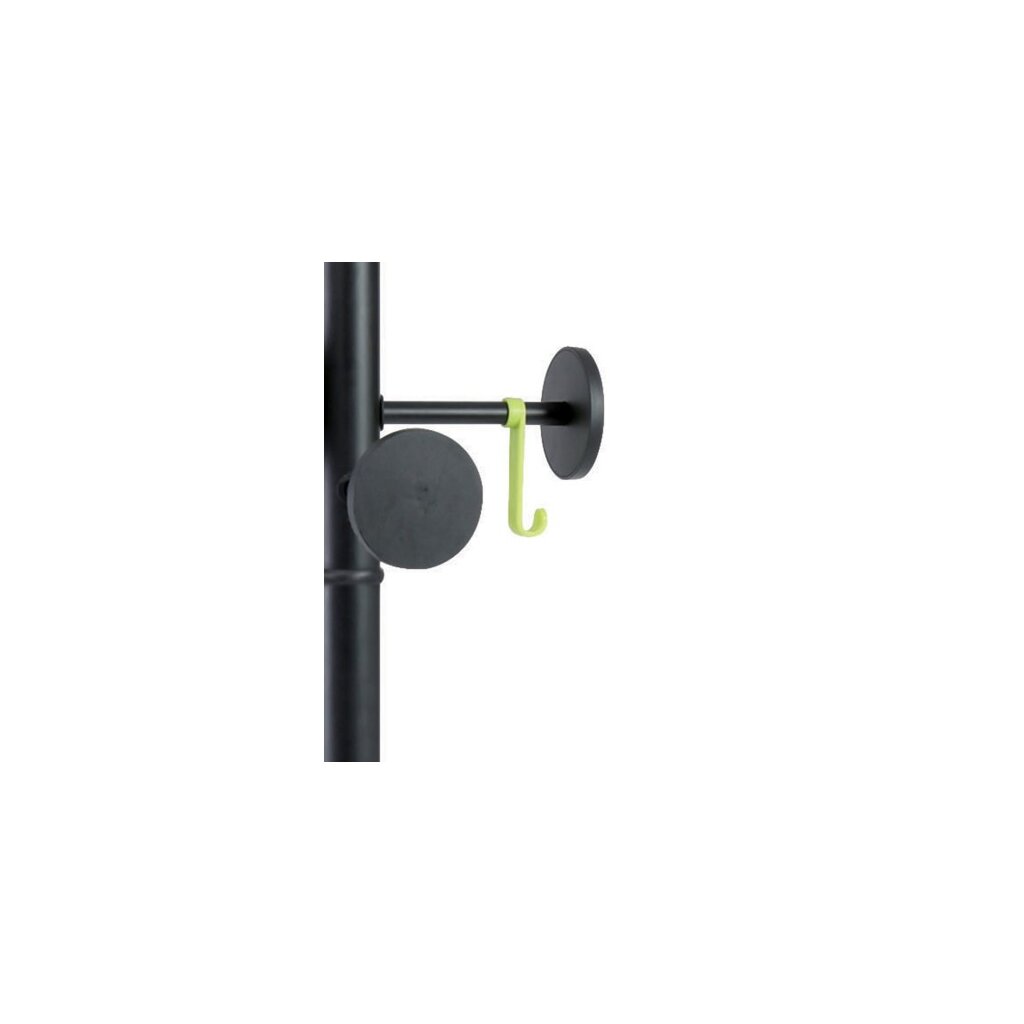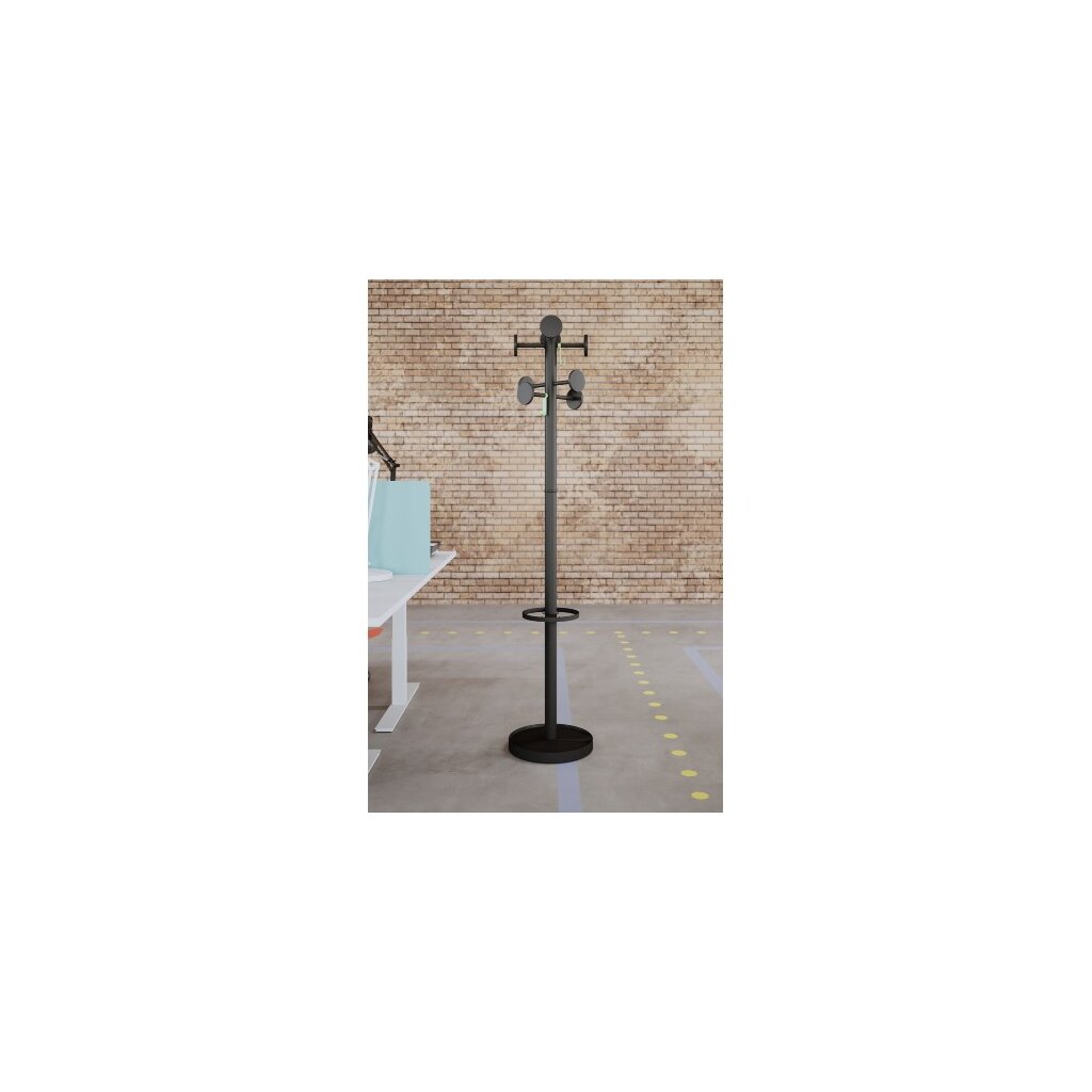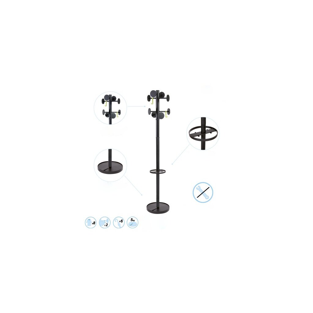 Diese Garderobe besteht aus einem Kopf mit 8 schwarzen Kunststoffhaken und 2 abnehmbaren Haken, einem Schirmständer und einem beschwerten Sockel mit Wasserbehälter.