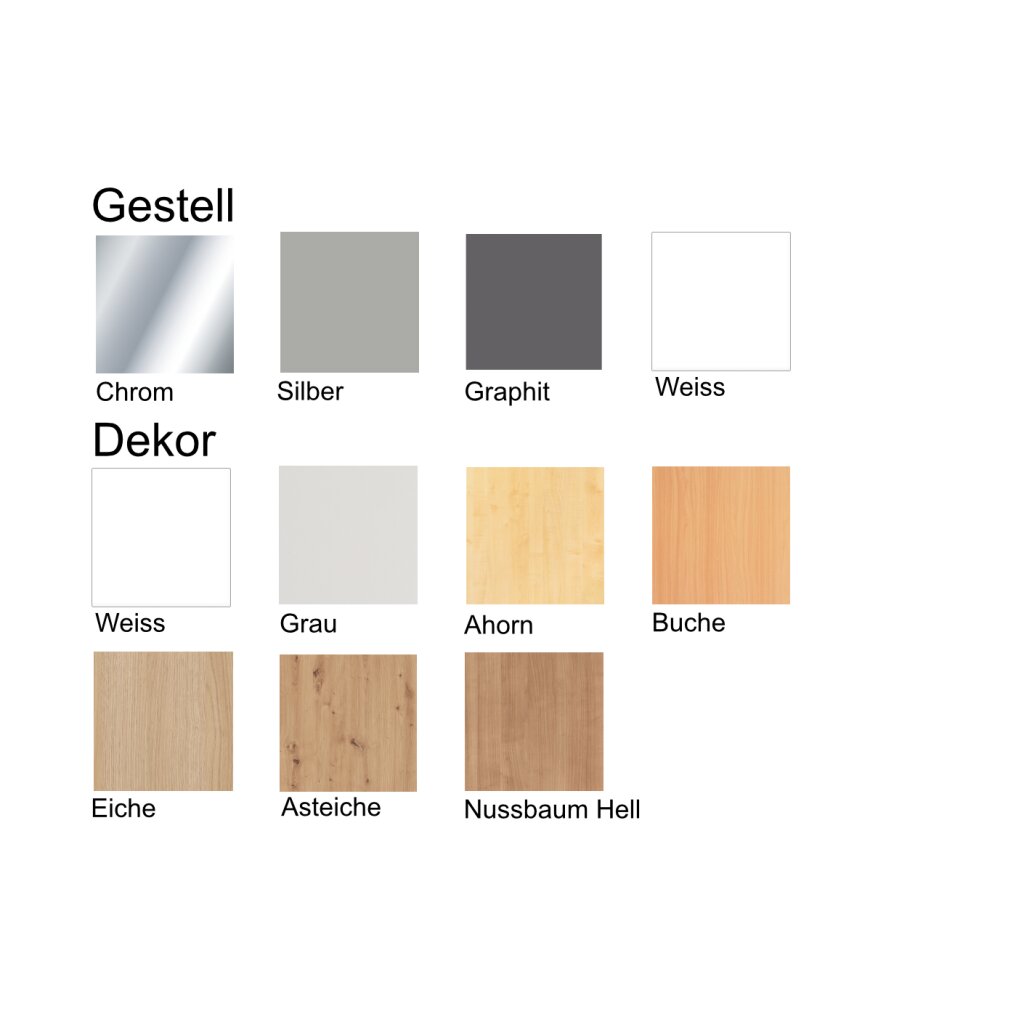 In folgenden Dekoren erhältlich: Weiss, Grau, Ahorn, Buche, Eiche, Asteiche, Nussbaum Hell