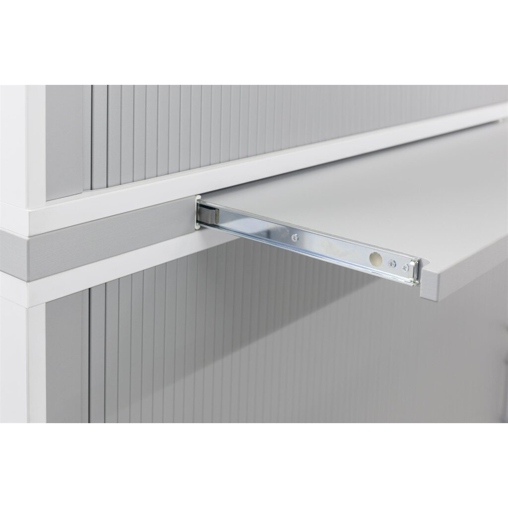 Hochertiger, PVC-freier einteiliger Rollladen, in Kunststoffschienen gleitend, nach rechts schließend, absperrbar. 2 Ordnerhöhen.