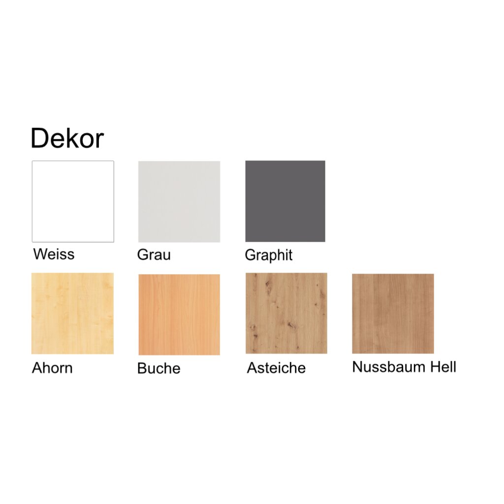 Front: Ahorn, Grau, Buche, Nußbaum Hell, Weiss, Eiche, Asteiche