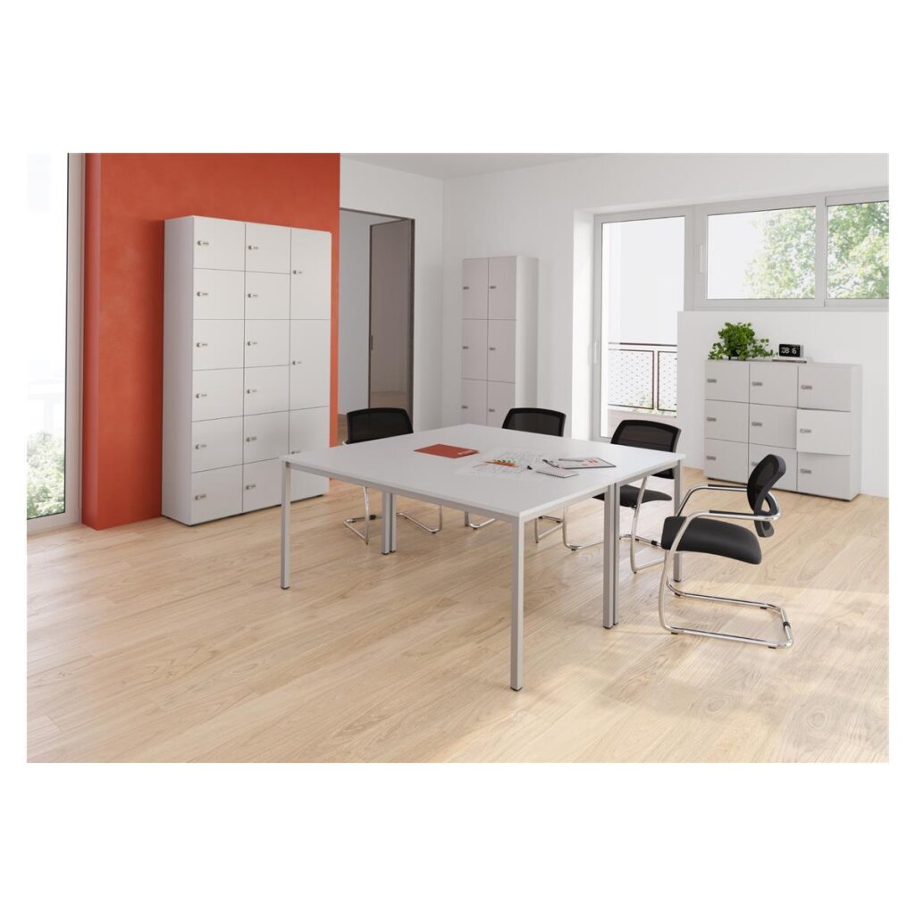 Es können mehrere Schränke miteinander kombiniert werden. Optional kann zu diesem Schrank ein Stahlsockel bestellt werden, dieser muss aber noch montiert werden.