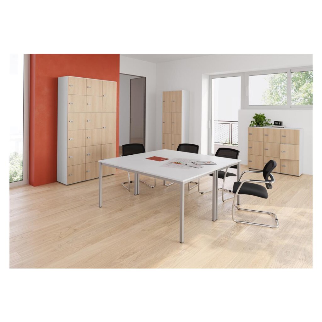 3 abschliessbare Türen übereinander, mit Garderobenhaken. Sie können zwischen Zylinderschloss oder Zahlenschloss wählen.