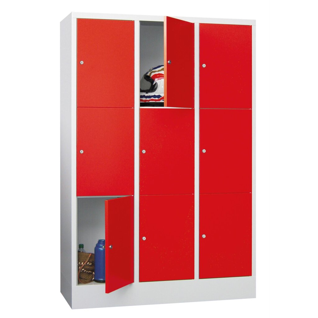 Insgesamt: 9 Fächer, 3 Abteile: 3 Fächer übereinander und 3 Fächer nebeneinander.