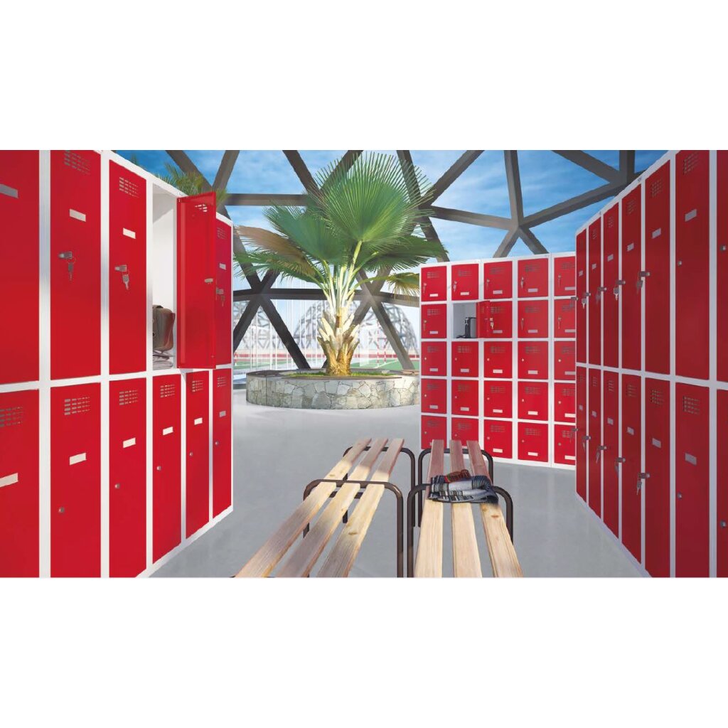 Modernes und überarbeitetes Design der Stahlspinde durch moderne und effektive Lüftungsschlitze sowie verkürzten Sockel für mehr Nutzfläche für die Schrankfächer. Der Sockel reicht dennoch aus um den Schrank bei der Bodenreinigung zu schützen.