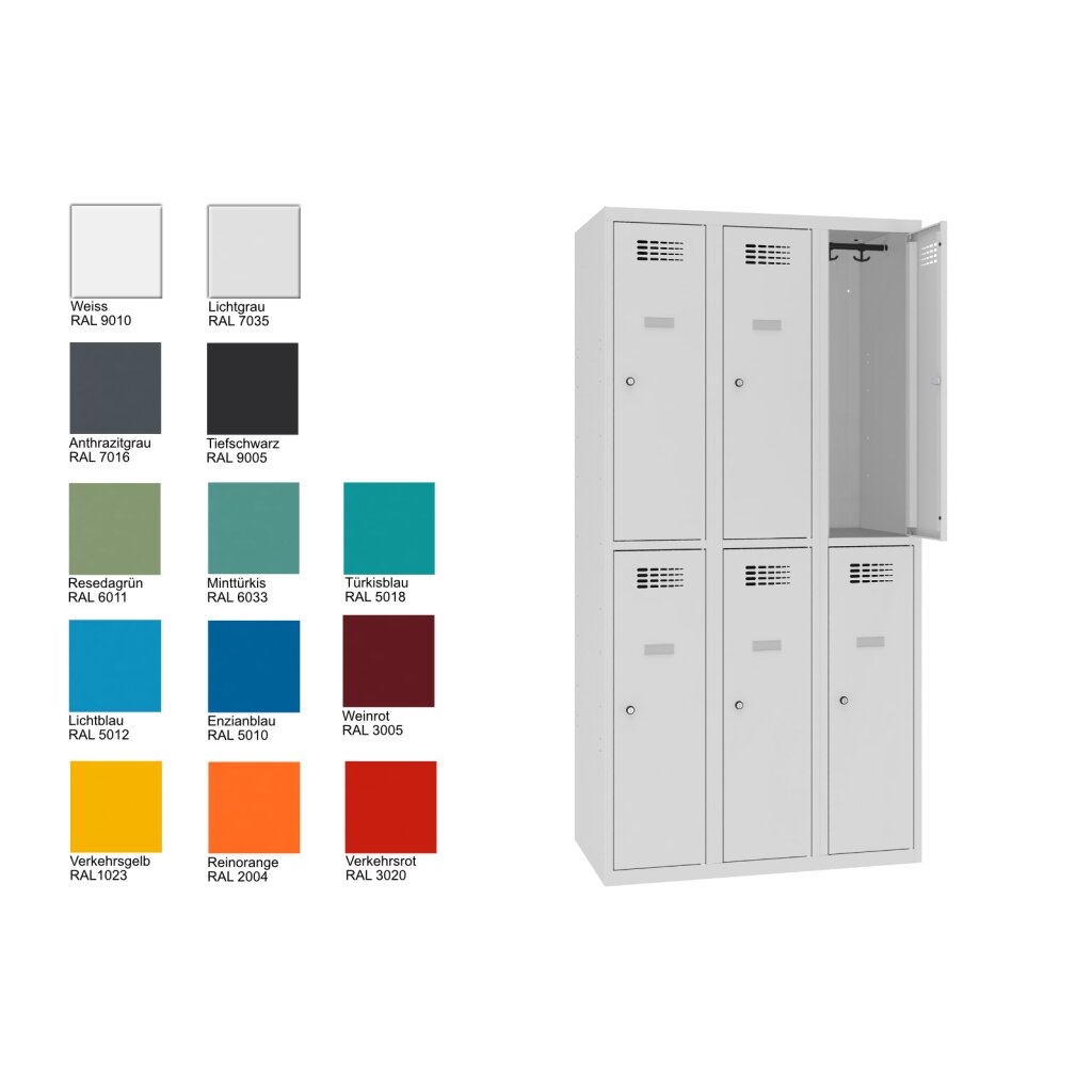 Robuste Pulverbeschichtung in grosser Farbauswahl. Farbe von Korpus und Türen kann unterschiedlich ausgewählt werden.