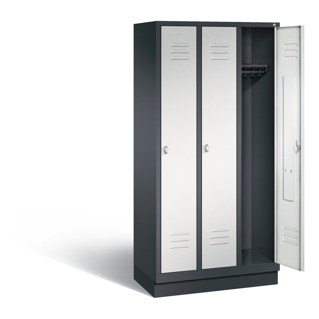Je Abteil ein fester oberer Ablageboden sowie eine Kleiderstange mit 3 verdrehsicheren Doppelschiebehaken