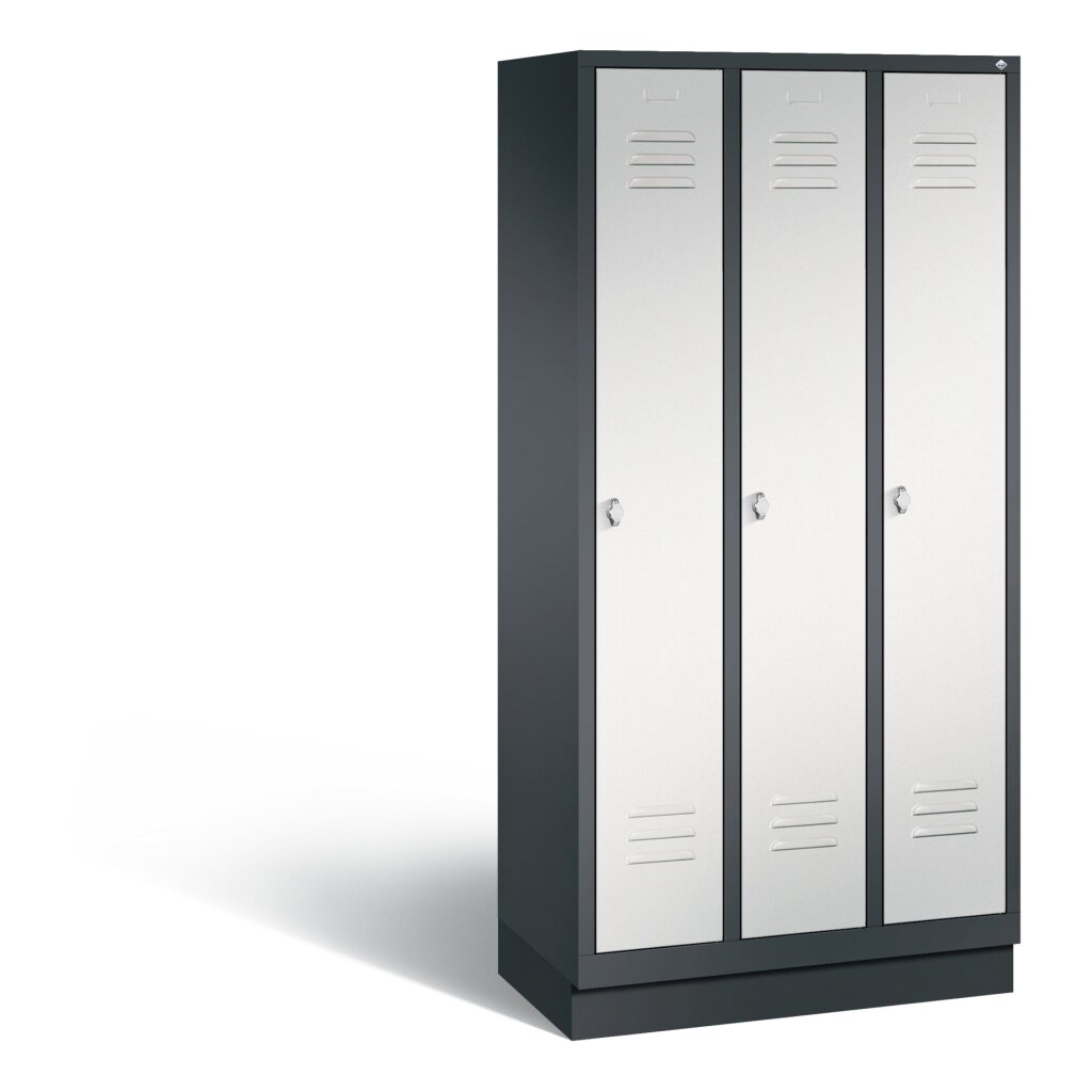 Schrank auf Sockel, Sockel immer in Korpusfarbe, vorne leicht zurückgesetzt für eine gut funktionierende Belüftung