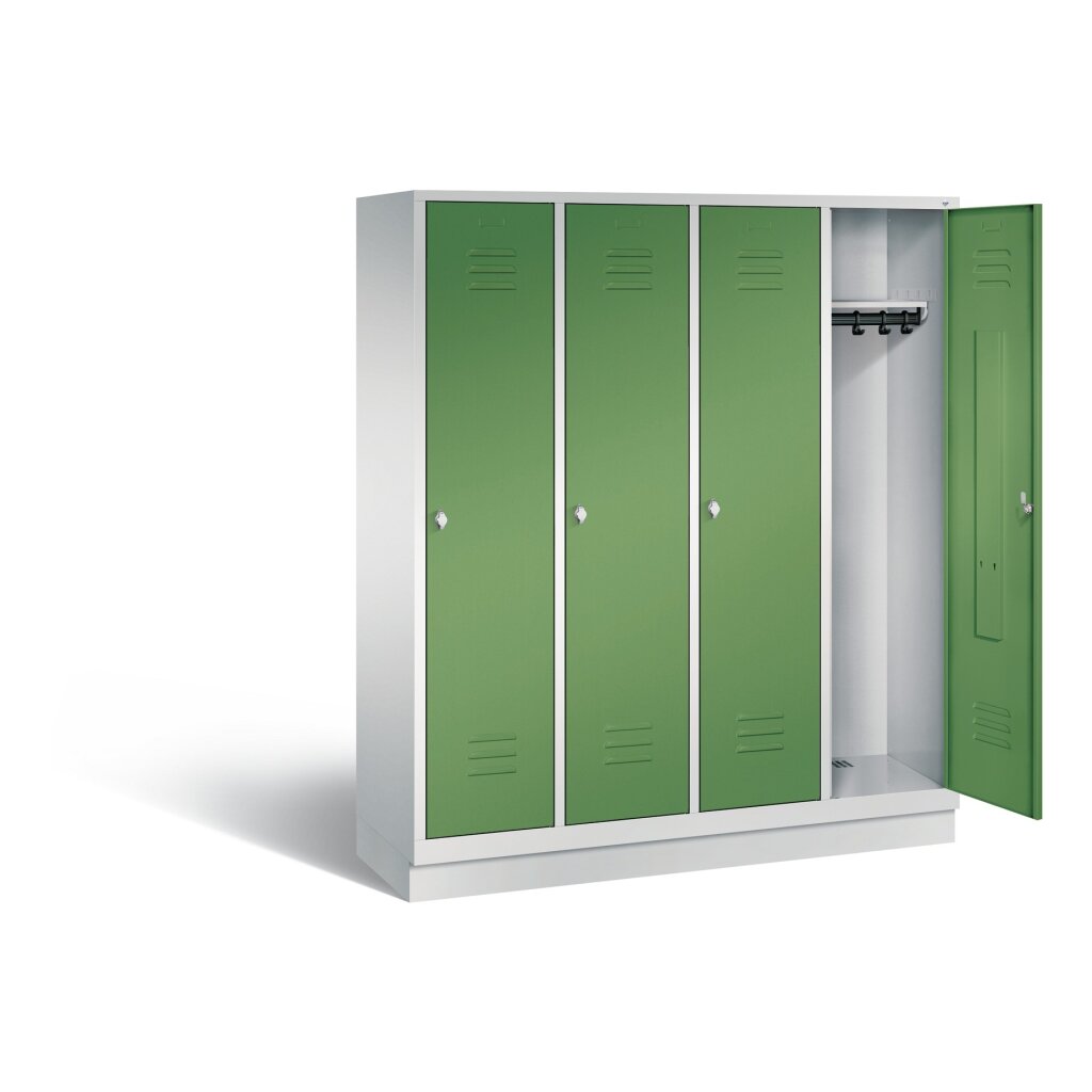 Schrank auf Sockel, Sockel immer in Korpusfarbe, vorne leicht zurückgesetzt für eine gut funktionierende Belüftung