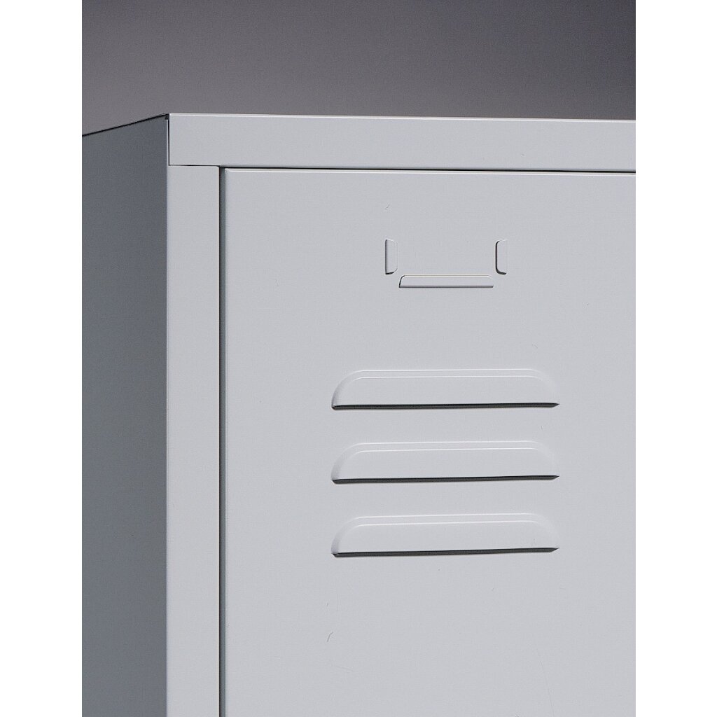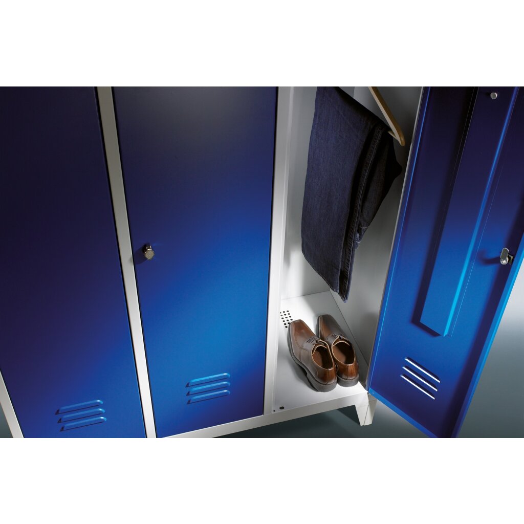 Türen mittig gemeinsam schliessend, zur Nutzung von 2 Abteilen durch eine Person, für Schwarz-Weiss Trennung oder zur Unterbringung für Straßen- und Berufskleidung in einem Doppelspind
