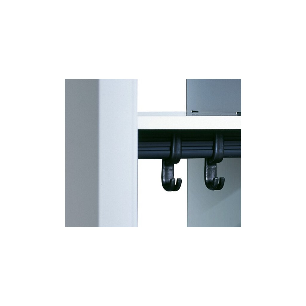 Je Abteil ein fester oberer Ablageboden sowie eine Kleiderstange mit 3 verdrehsicheren Doppelschiebehaken