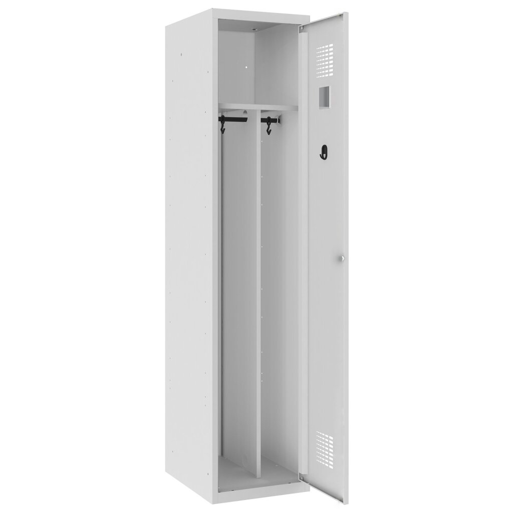 Pro Abteil unter dem Fachboden ist eine Mitteltrennwand fest verbaut, die das Abteil nochmal 2/3 zu 1/3 in der Breite teilt. Auf Anfrage kann der Spind auch ohne Mitteltrennwand geliefert werden.
