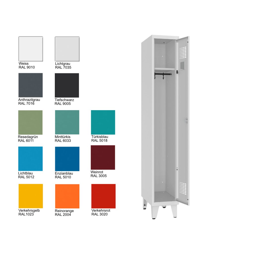 Robuste Pulverbeschichtung in grosser Farbauswahl. Farbe von Korpus und Türen kann unterschiedlich ausgewählt werden.