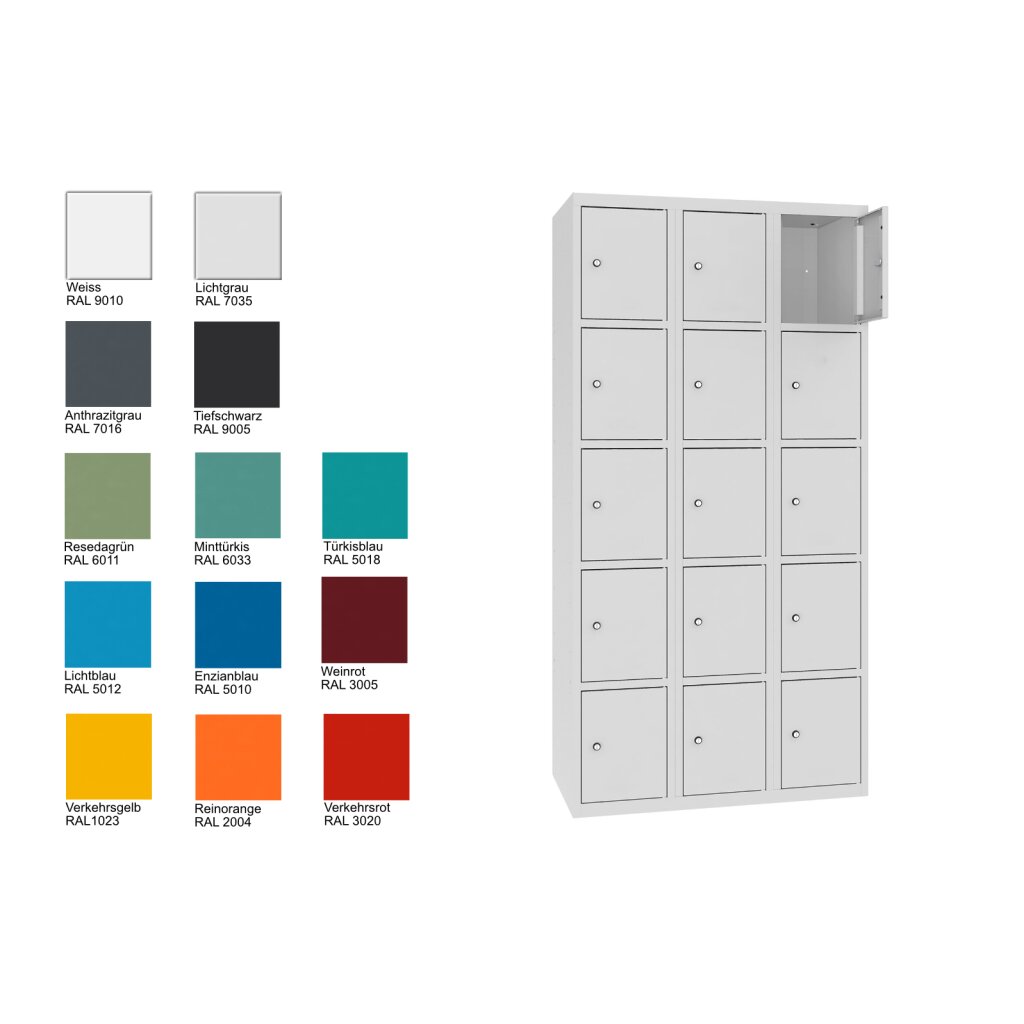 Insgesamt 15 Fächer, 3 Abteilreihen mit je 5 Türen übereinander