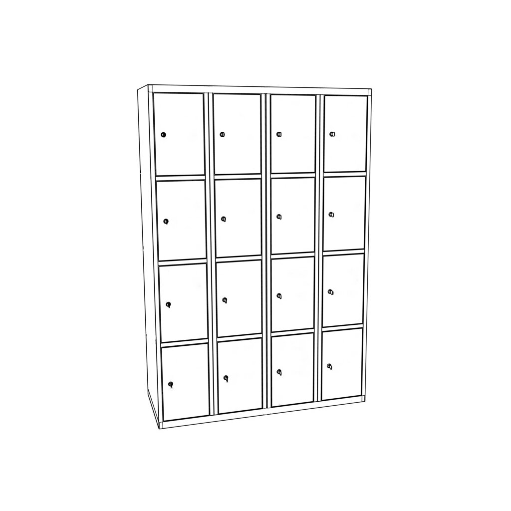 Insgesamt 16 Fächer, 4 Abteilreihen mit je 4 Türen übereinander