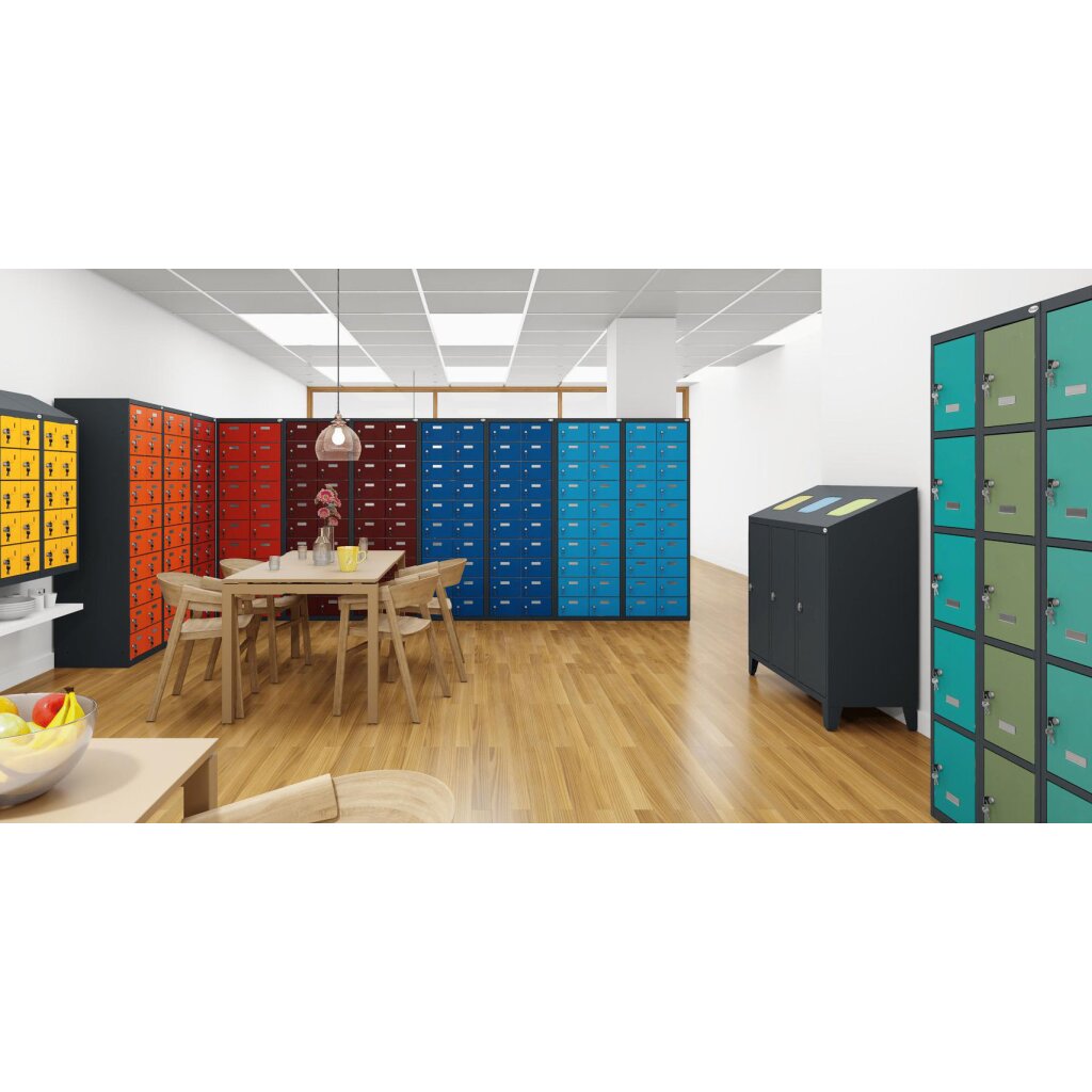 Modernes und überarbeitetes Design der Fächerschränke durch den verkürzten Sockel erhöht sich die Nutzfläche der Schrankfächer. Der Sockel reicht dennoch aus um den Schrank bei der Bodenreinigung zu schützen.