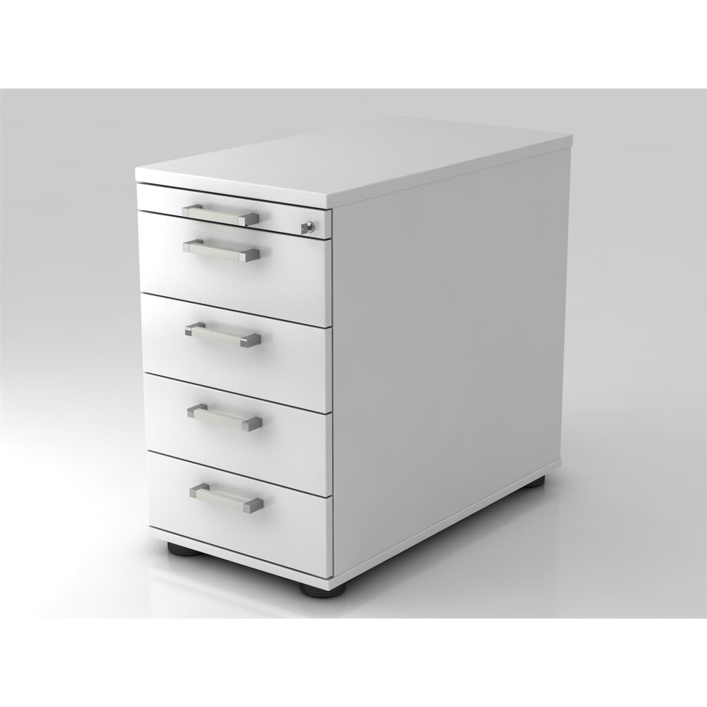 Standcontainer mit 4 Schubladen, 1 x Utensilienfach, 80 cm Tief abschließbar Weiss/ Weiss