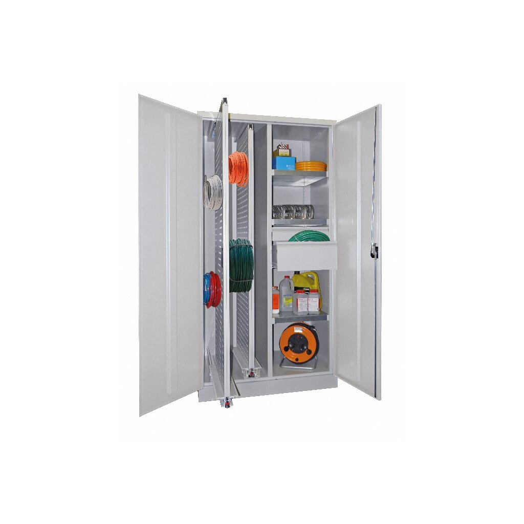 Vertikalauszugsschrank mit 2 Auszügen Fachböden und Schubladen