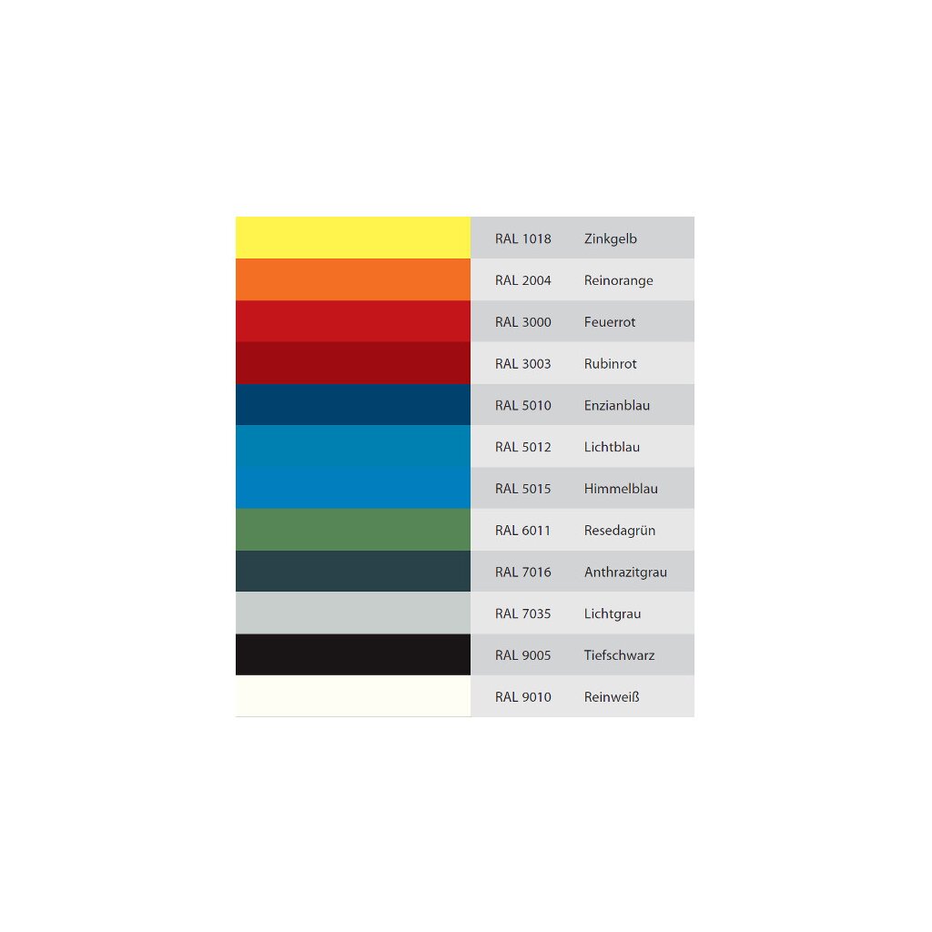 !!! Farben Zinkgelb, Reinorange, Rubinrot, Resedagrün und Tiefschwarz haben eine verlängerte Lieferzeit von ca. 10 Arbeitstagen