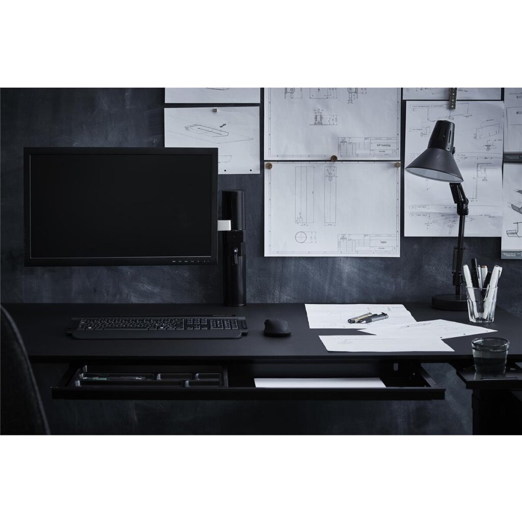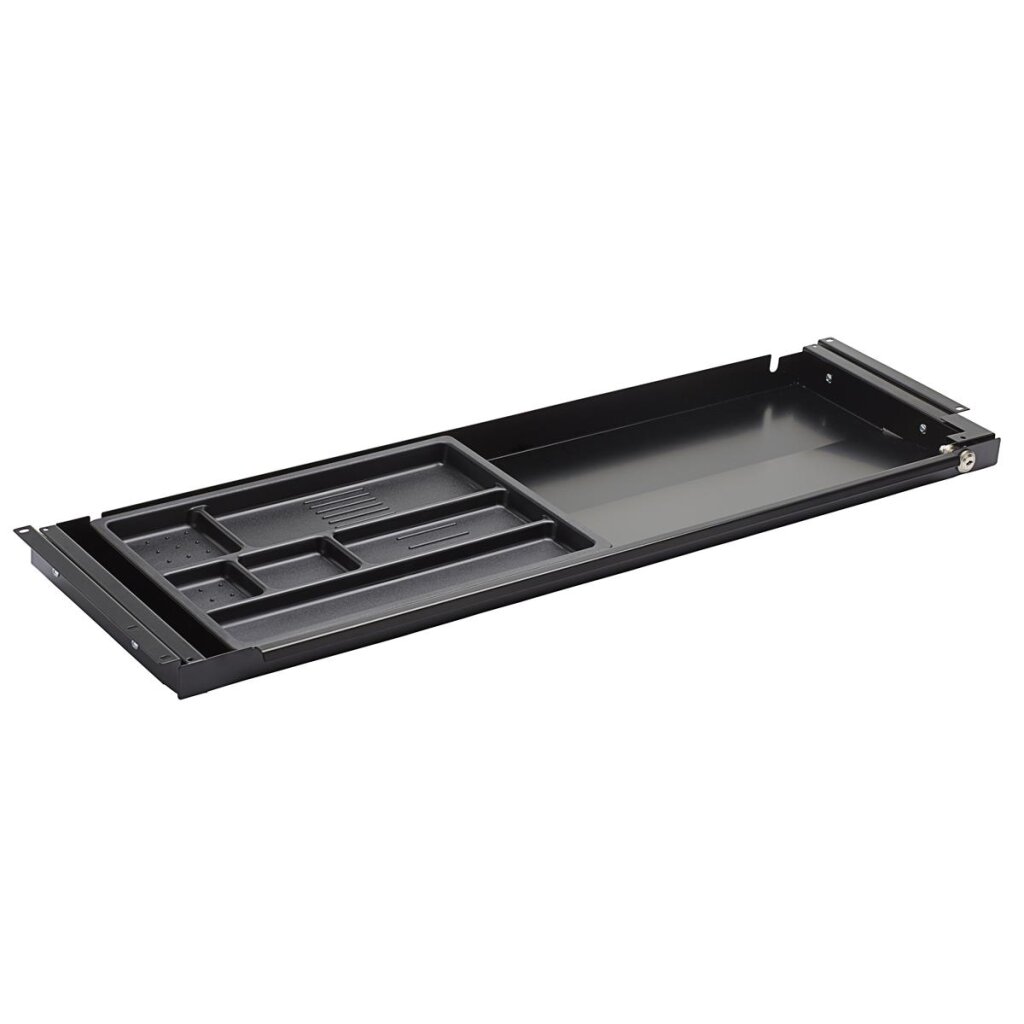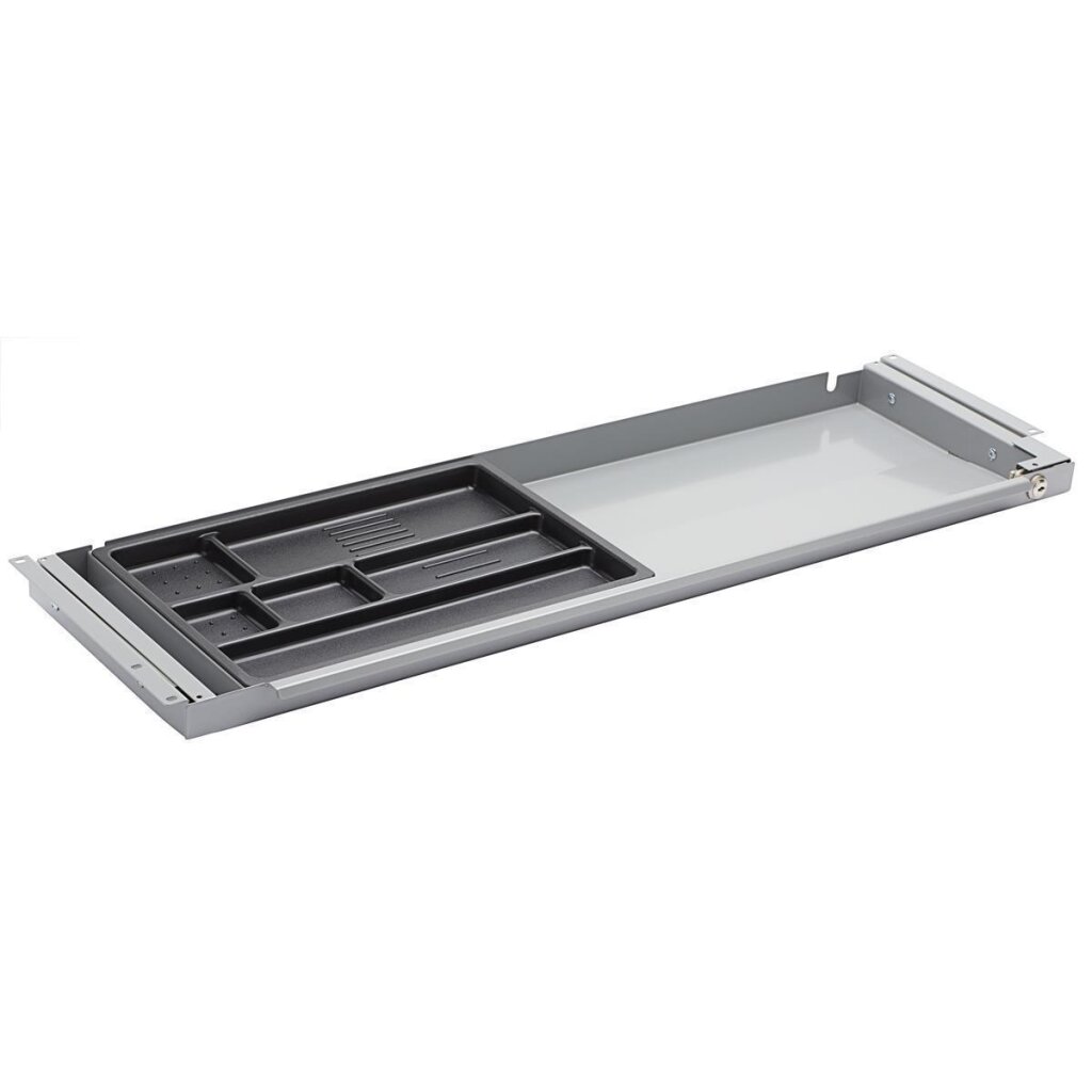 Durch die Tiefe von 26 cm kann diese Schublade aus Metall an fast jedem Schreibtisch montiert werden*. Die Vorderseite der Schublade ist schmal mit einem eleganten und leicht zugänglichen Griff. Der Kunststoffeinsatz lässt sich durch einen Handgriff leicht entfernen.